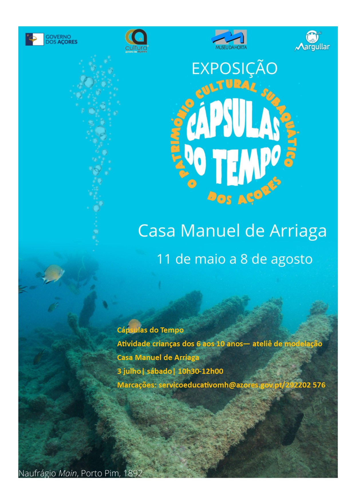 O Museu da Horta promove, na Casa Manuel de Arriaga, no dia 3 de julho, sábado, entre as 10h30 e as 12h00, um ateliê de modelação para crianças dos 6 aos 10 anos. Esta atividade lúdica insere-se no âmbito da exposição temporária “Cápsulas do Tempo, o Património Cultural Subaquático dos Açores”, patente ao público na Casa Manuel de Arriaga, até dia 8 de agosto. Durante a atividade os participantes terão a oportunidade conhecer o património subaquático e desenvolver uma atividade na área da modelação.