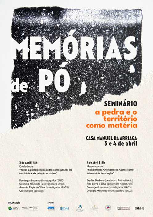 No dia 3 de abril, às 18h, terá lugar, na Casa Manuel de Arriaga, a conferência “Tocar a paisagem: a pedra como génese do território e da criação artística”, com Domingos Loureiro, Graciela Machado e Antonio Regis da Silva, sobre trabalho produzido durante as residências artísticas e a forma como se cruza com a pesquisa que é desenvolvida pelo i2ADS. O evento contará, também, com a participação do geólogo Carlos Faria, que fará uma intervenção sobre rochas vulcânicas dos Açores.