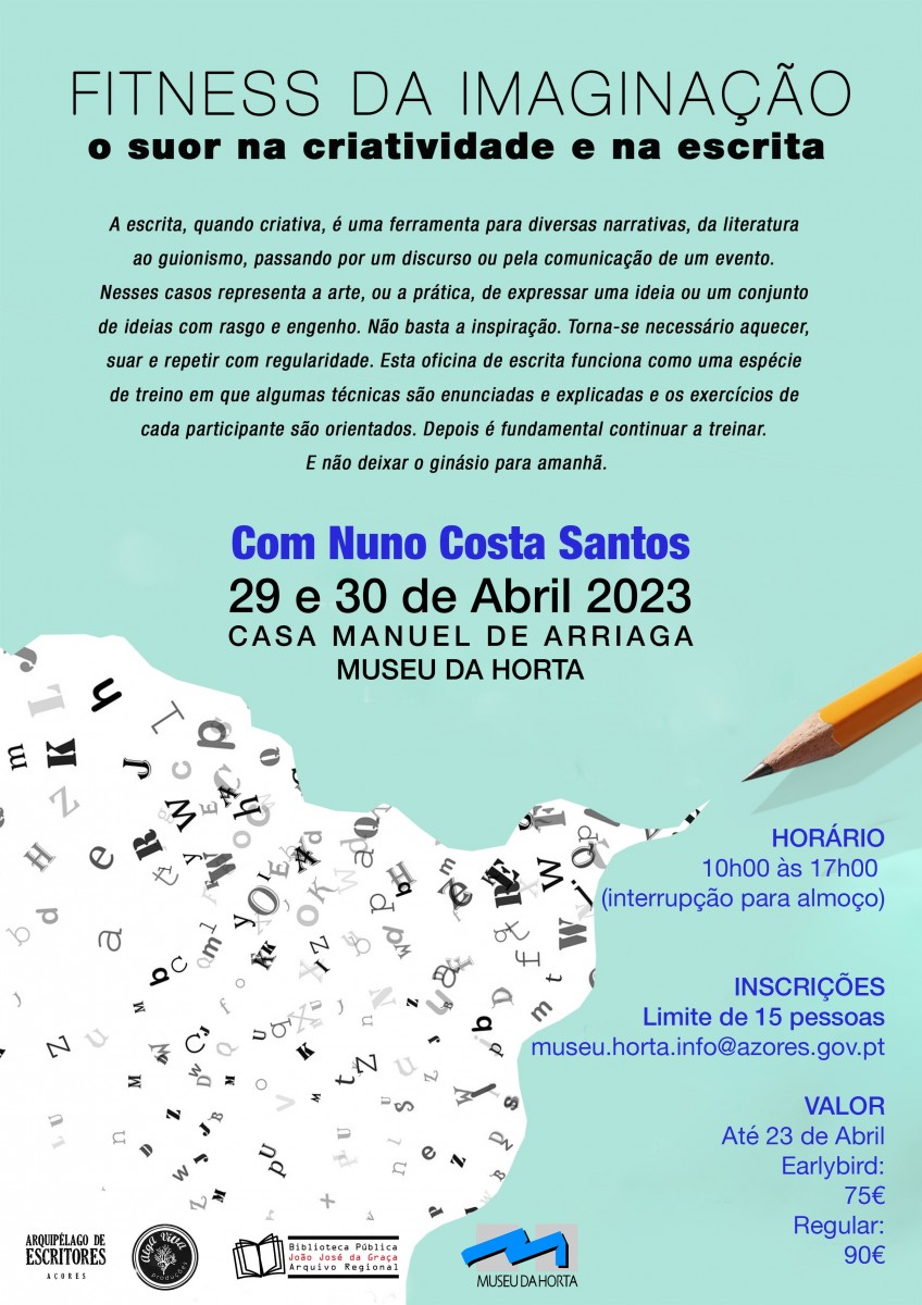 O Museu da Horta associa-se à Alga Viva Produtores, em parceria com a Biblioteca Pública e Arquivo Regional João José da Graça, para a realização da oficina de escrita “Fitness da Imaginação: o suor na criatividade e na escrita” com o escritor Nuno Costa Santos, a decorrer nos dias 29 e 30 de abril, das 10h às 17h, na Casa Manuel de Arriaga.