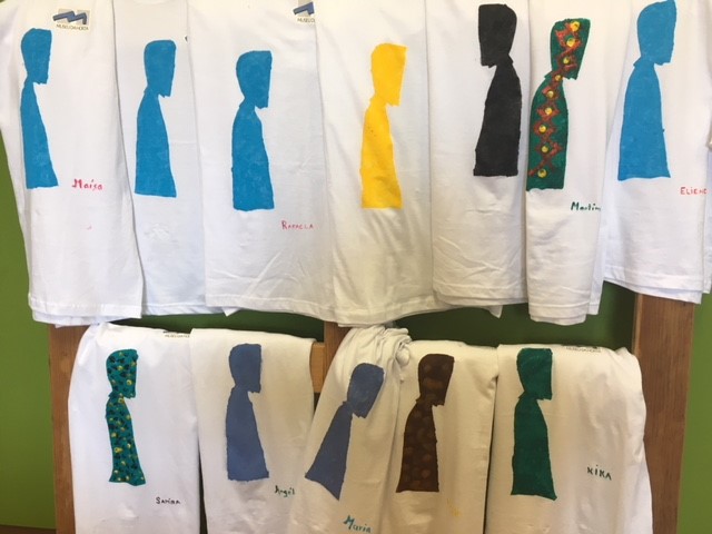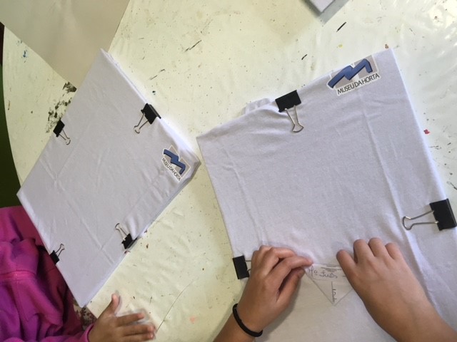 Durante a sessão do dia 28, apresentámoss uma peça em exposição no Museu - Capote e experimentámos a pintura em tecido.