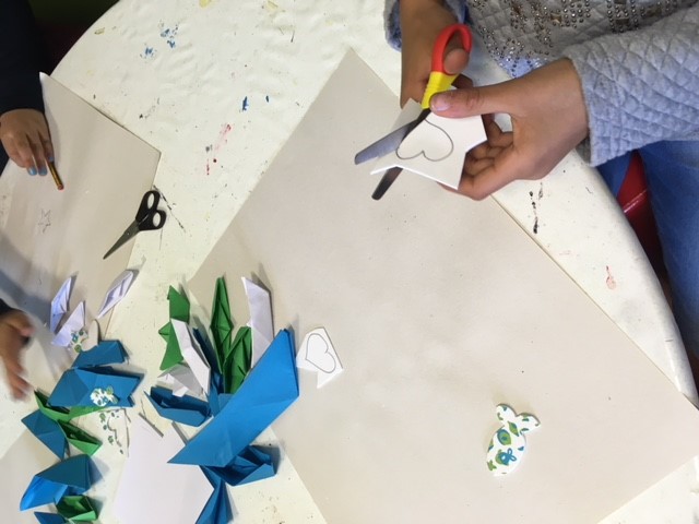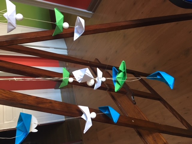 Na tarde do dia 27, fizemos uma abordagem ao miolo de figueira e, na impossibilidade de trabalhar este material devido aos instrumentos que exige, realizámos um origami e com ele montámos um mobile.